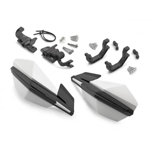 Thanks to splitting of the surfaces, these open, very light KTM MX handguards ensure an uncompromising racing look in the angular KTM design. In two-component injection moulding technology: