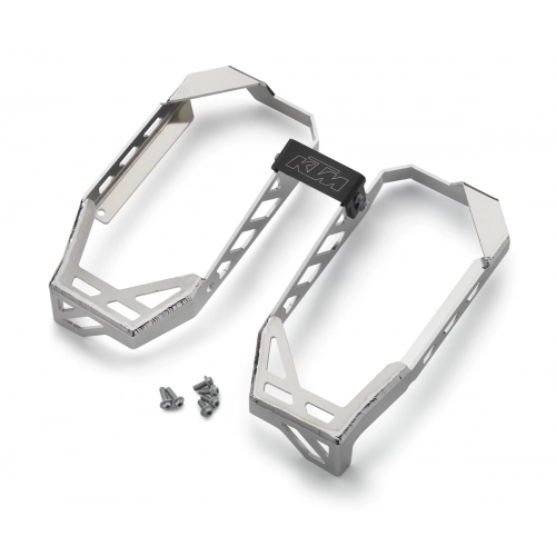 The crash bar for radiators. Newly developed and made from high-strength aluminum, it provides maximum protection for minimum possible weight. Installation not possible with larger tanks that take the place of the radiator spoiler.