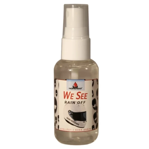 We See Rain Off etterlater en usynlig film som er vann-avvisende slik at regndråpene preller av så at du får bedre sikt i regnet.
